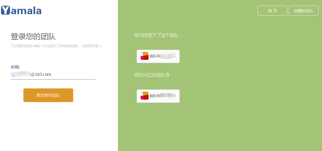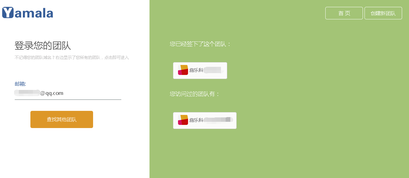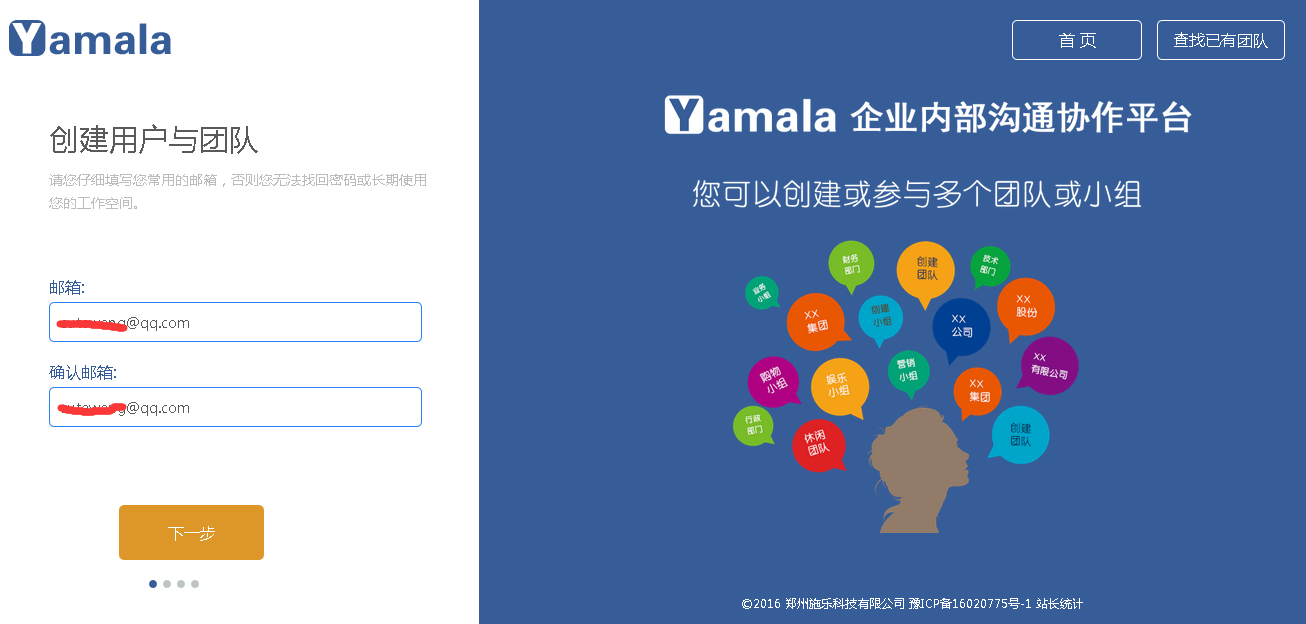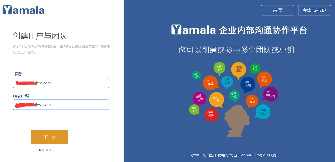 打开浏览器、在地址栏输入www.yamala.cn,点击回车,进入亚马拉团队协作主页,点击右上角创建团队或在下面输入您的邮箱号码即可进入创建团队界面,如下图: