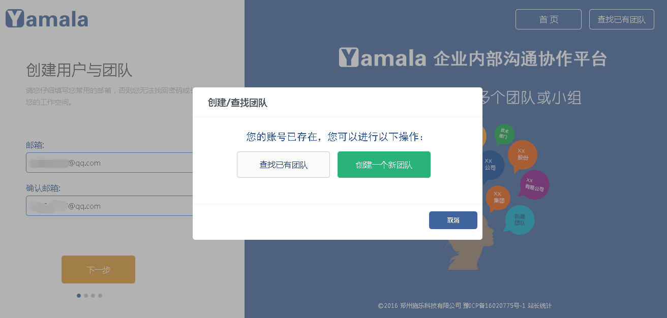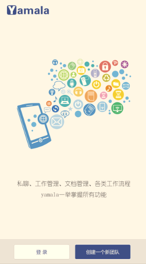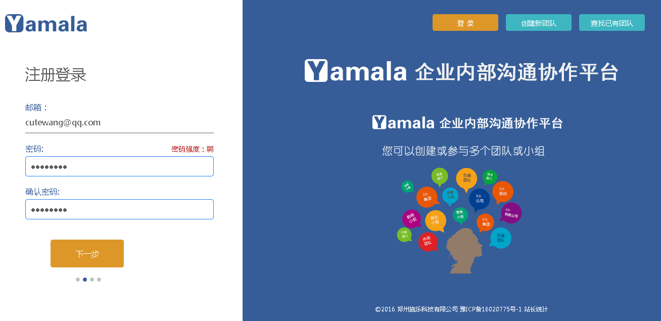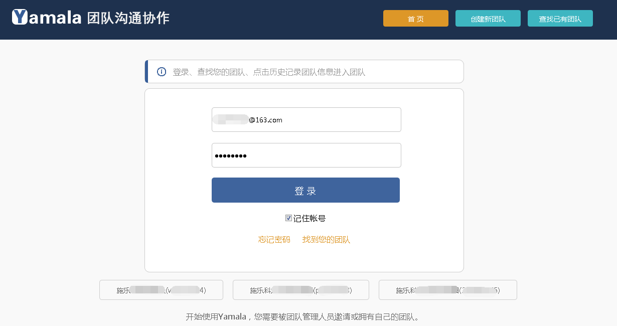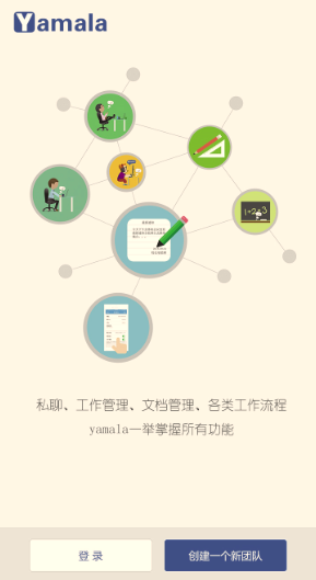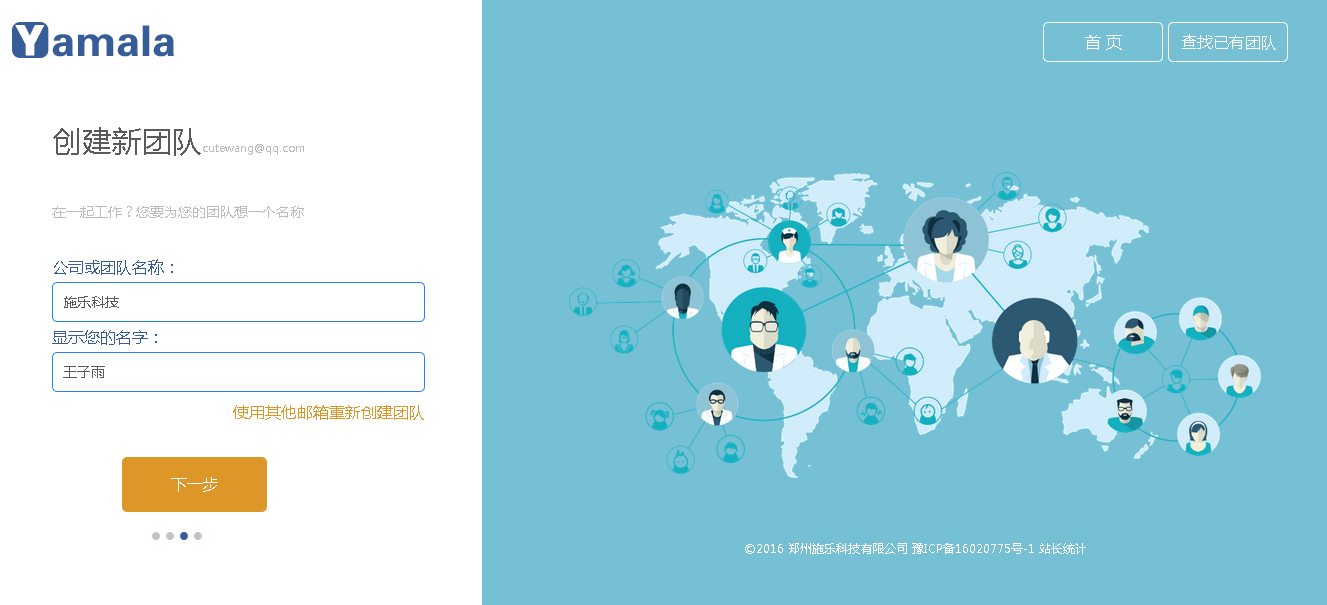 打开浏览器、在地址栏输入www.yamala.cn,点击回车,进入亚马拉团队协作主页,点击右上角创建团队或在下面输入您的邮箱号码即可进入创建团队界面,如下图: