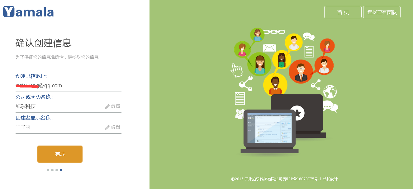 打开浏览器、在地址栏输入www.yamala.cn,点击回车,进入亚马拉团队协作主页,点击右上角创建团队、或在下面输入您的邮箱号码即可进入创建团队界面,如下图: