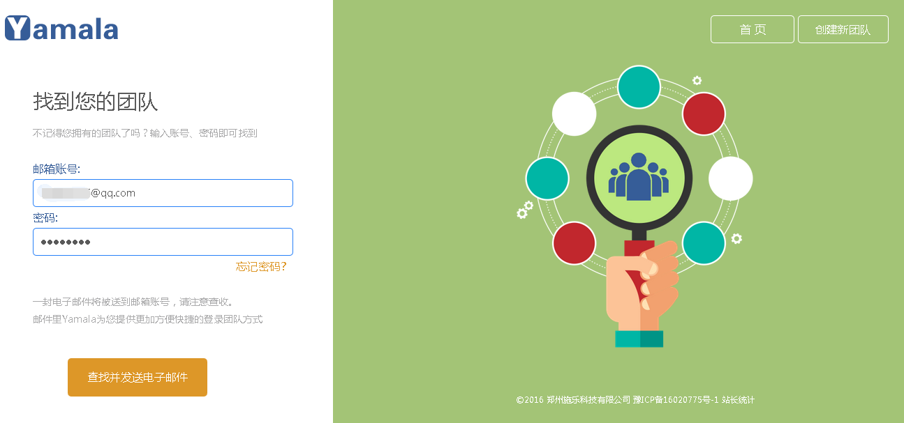 输入您的账号(邮箱号)和网站登录密码点击“查找并发送电子邮件”按钮,系统会查找并显示在右边,系统还会给您发送您创建或参与的团队名称链接到您的邮箱里,注意如果收件箱没有信件,请点击垃圾箱,如下图: