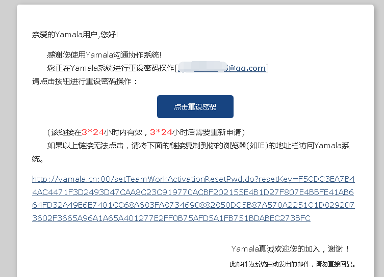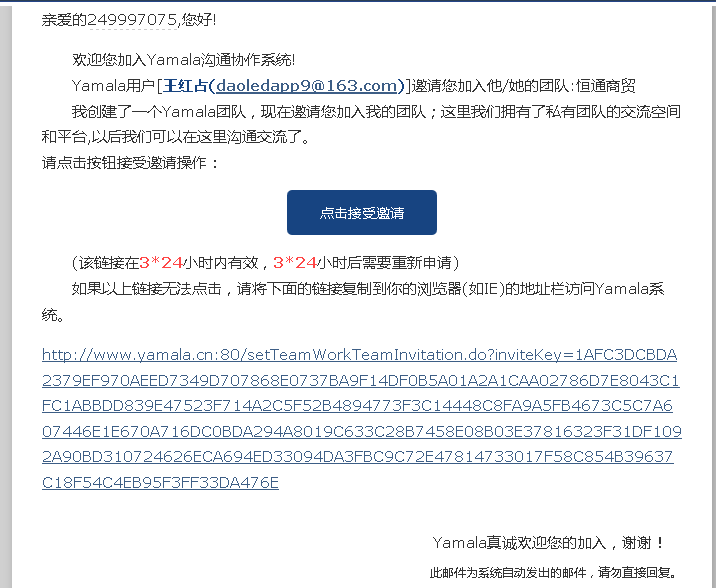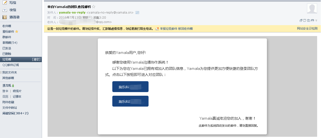 打开您的邮箱,如果在收件箱找不到邀请邮件,请您点击或刷新邮箱点击垃圾箱查看团队邀请邮件,找到“yamala-no-reply@yamala.cn来自Yamala的团队邀请邮件”打开邮件如下图: