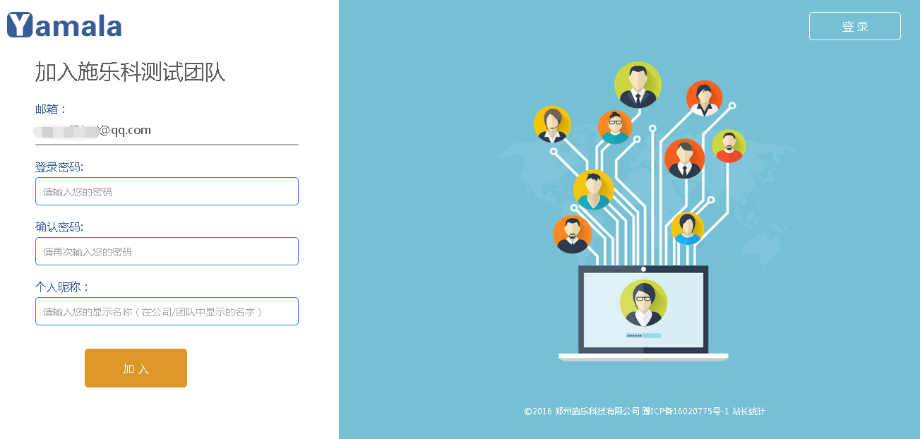 打开浏览器、在地址栏输入www.yamala.cn,点击回车,进入亚马拉团队协作主页,点击右上角登录按钮、即可进入登录界面,如下图: