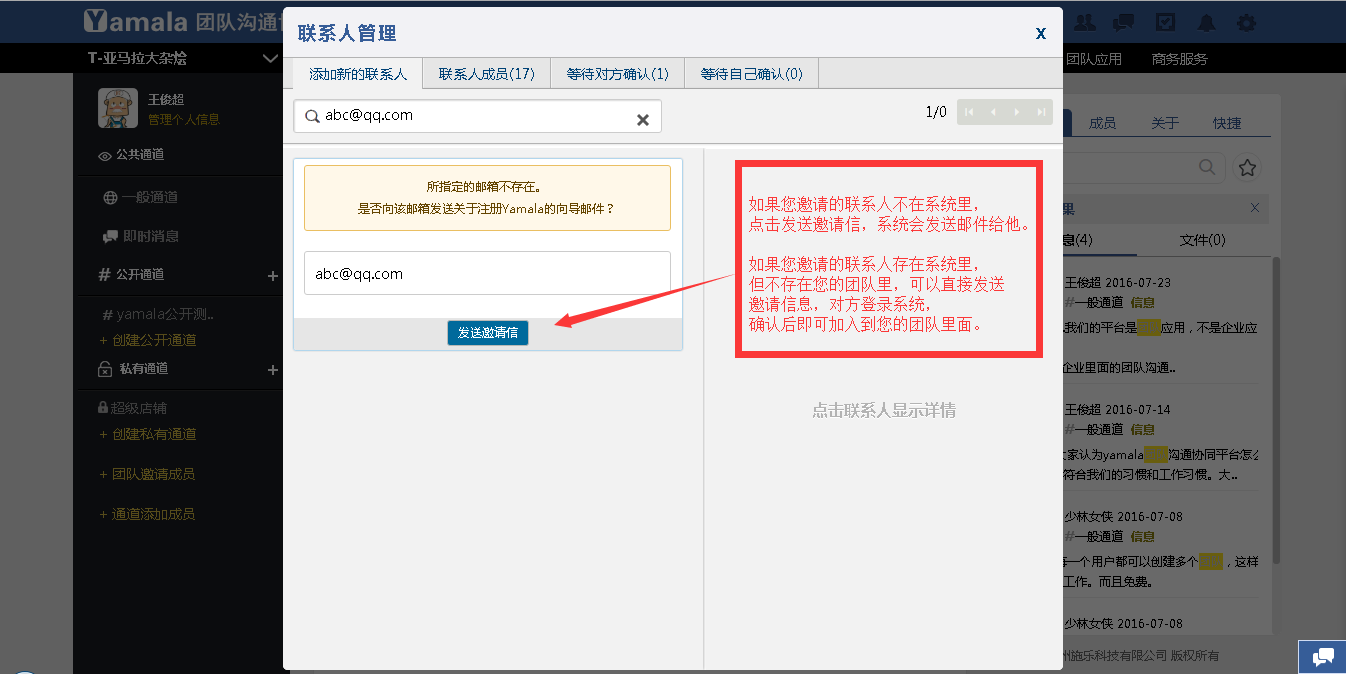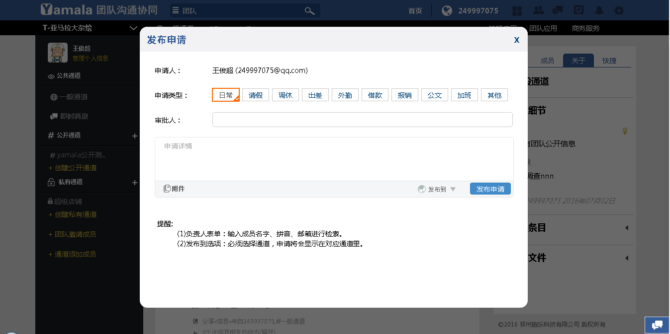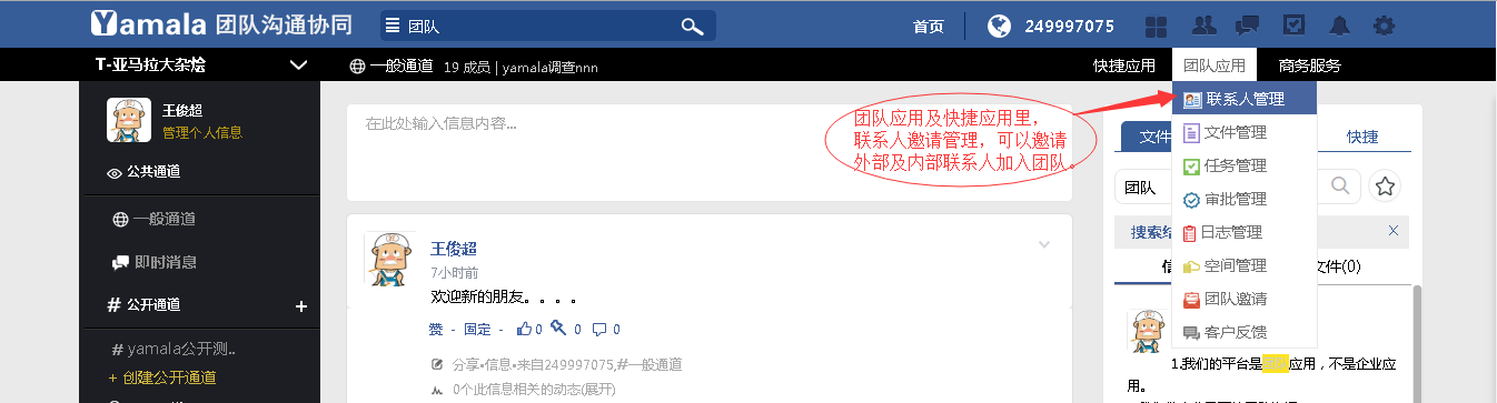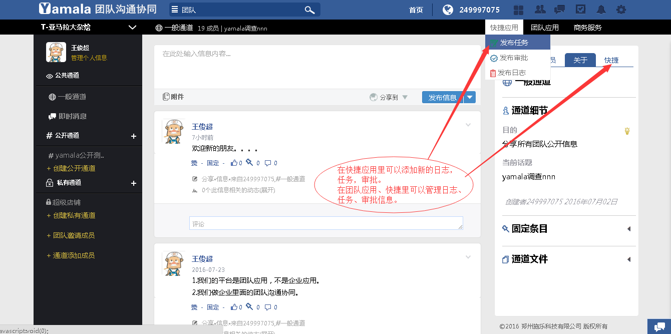 5:创建通道:可以创建通道、创建通道包含通道名称,介绍,成员,如果想要添加成员,可以在右边的快捷里面邀请团队已存在的成员,加入到当前通道里;