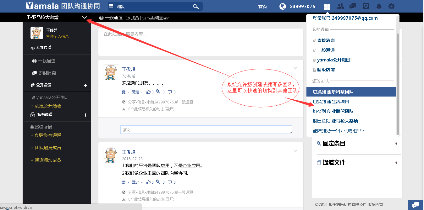 4:团队,显示您拥有的通道或团队信息,点击可以切换团队;