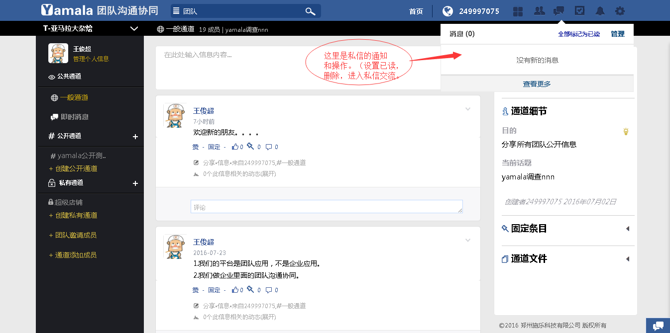 3:公开通道:公开通道是建立一个公开的通道并可以交流,其他用户可以查看,如果是通道成员即可发表评论和交流;