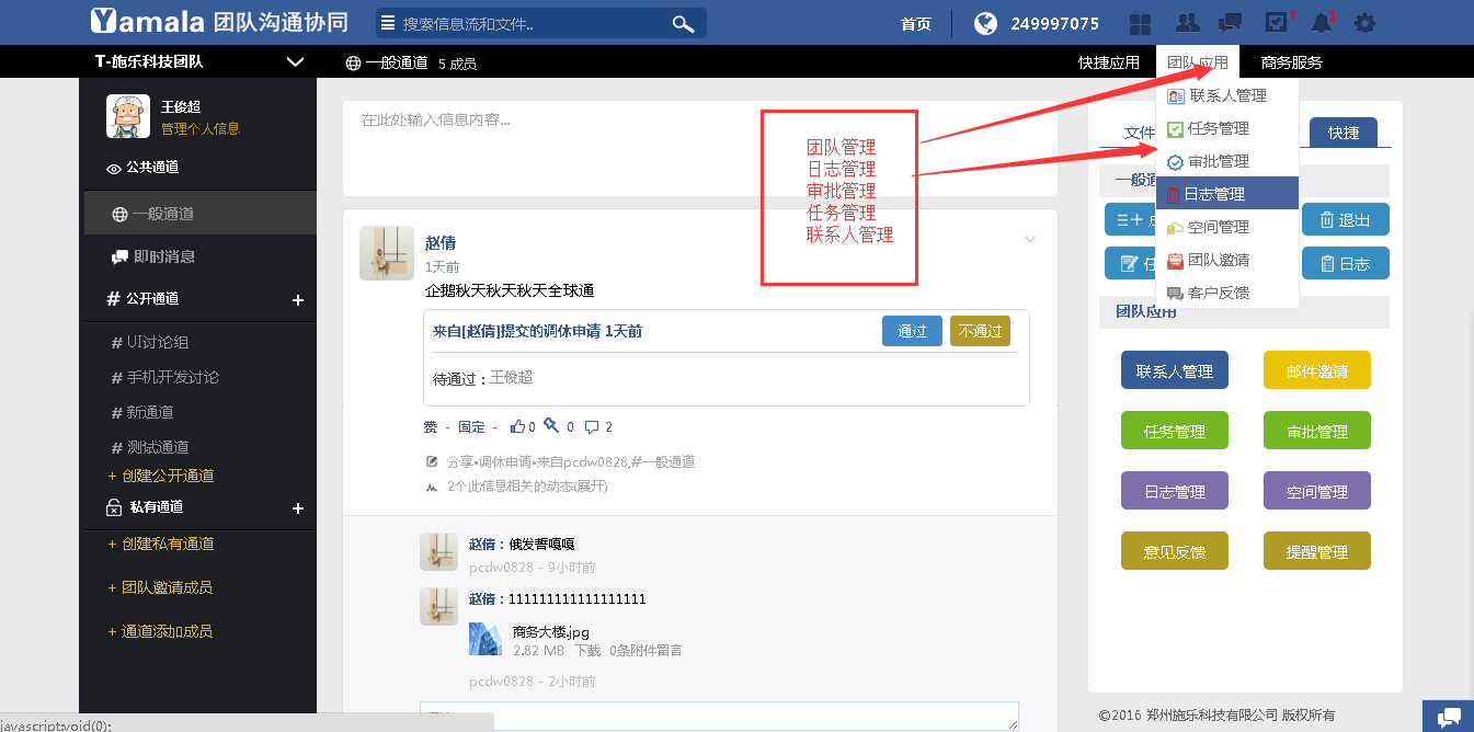 12:菜单有审批、日志、任务、文件、空间、团队管理快捷方式和功能;