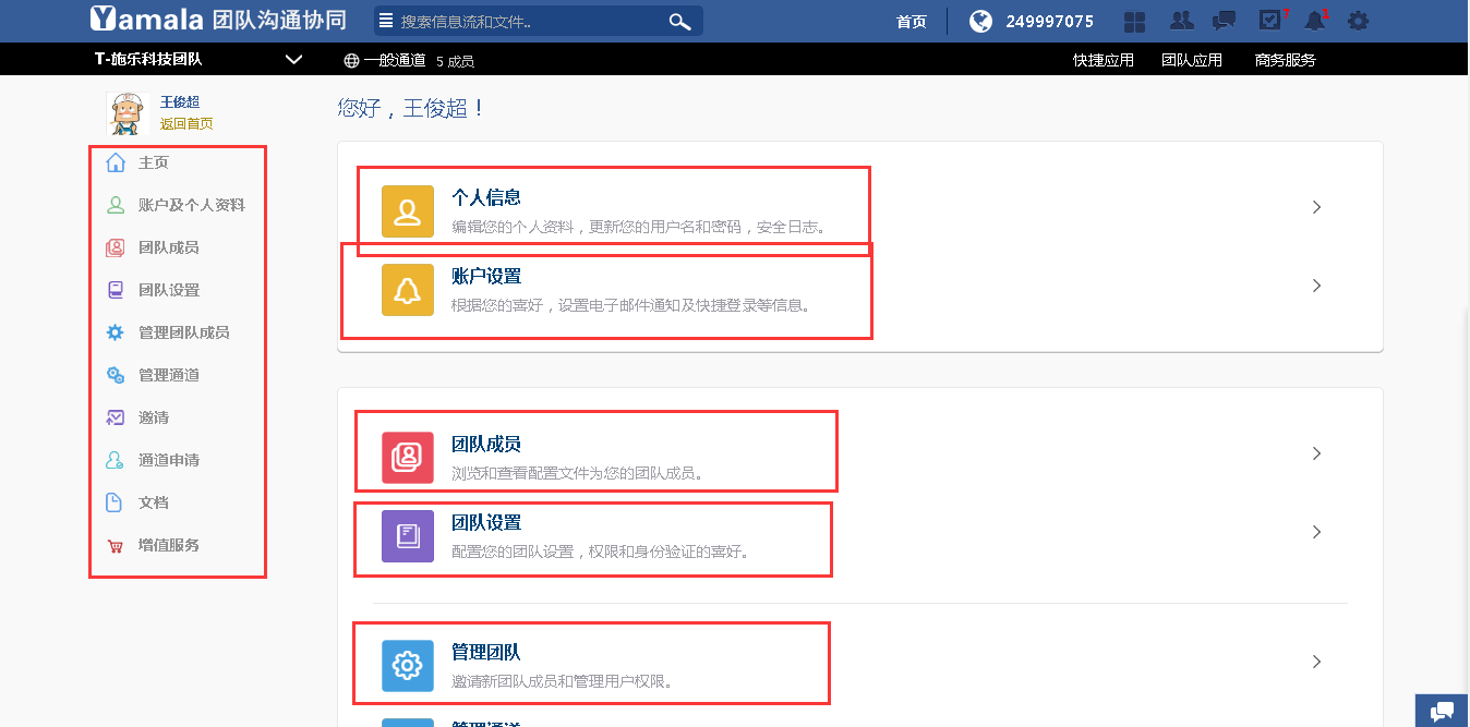 1:点击管理个人信息,进入管理界面可以设置用户、团队、文件等信息;